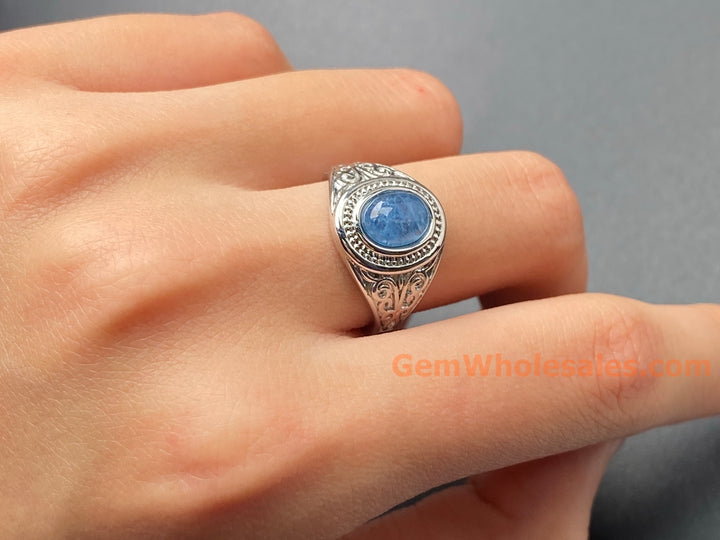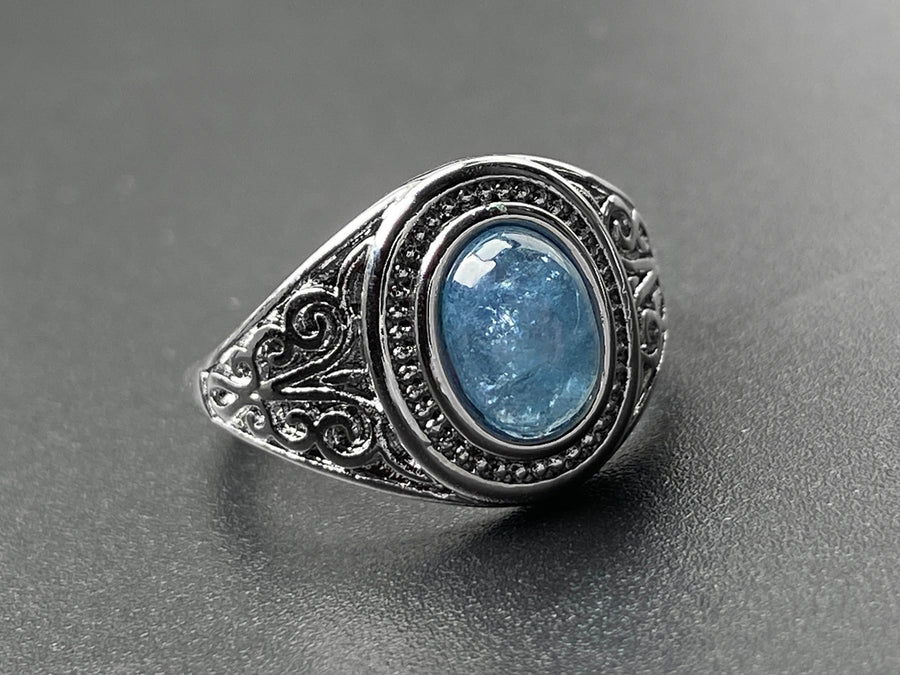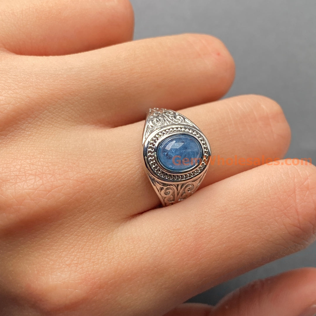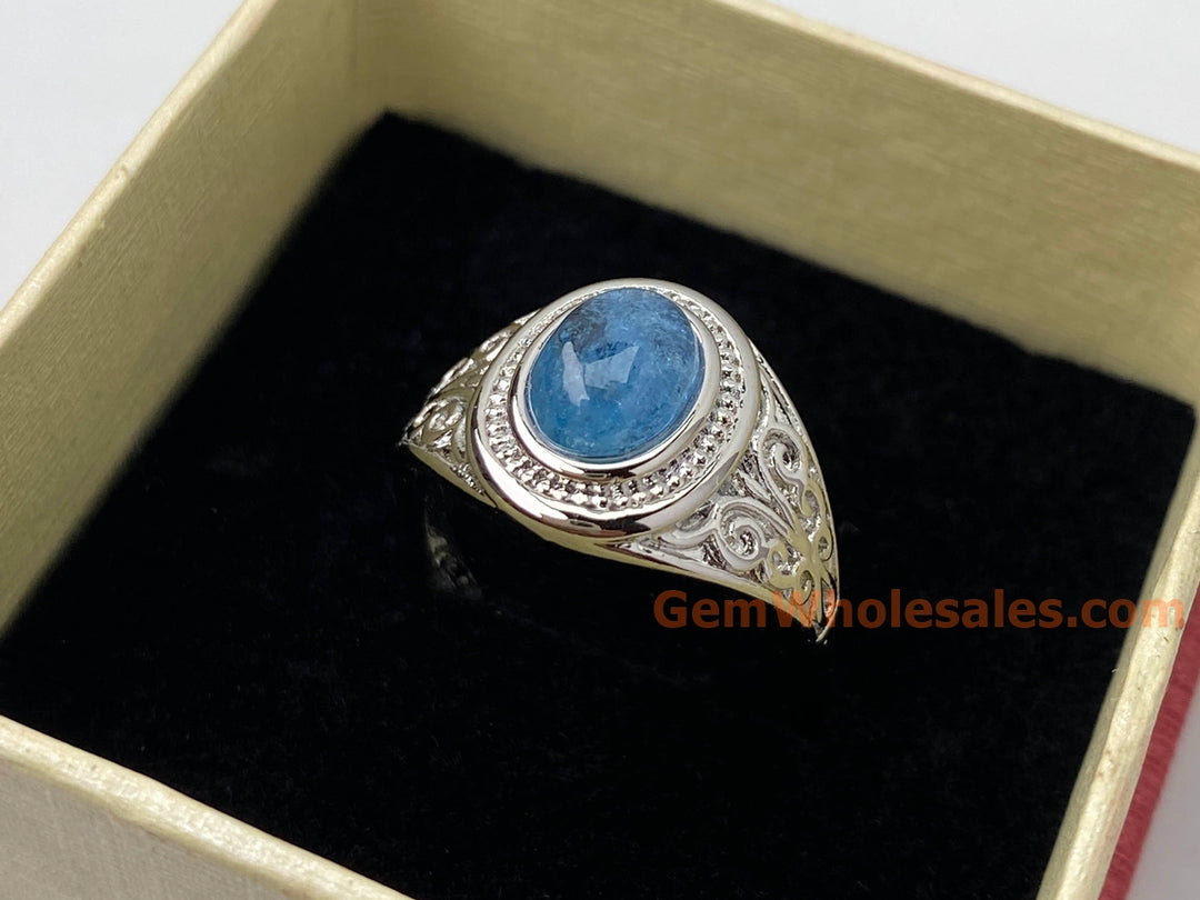 Bagues en laiton couleur argent avec pierre aigue-marine naturelle véritable 6x8 mm